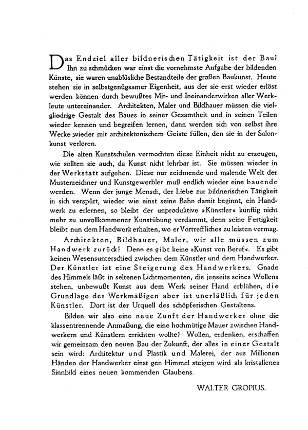¡El último fin de toda actividad plástica es la arquitectura! Decorar las edificaciones fue antaño la tarea mas distinguida de las artes plásticas, que constituían elementos inseparables de la gran arquitectura. Actualmente presentan una independencia autosuficiente de la que solo podrán liberarse de nuevo a través de una colaboración consciente de todos los profesionales. Arquitectos, pintores y escultores deben volver a conocer y concebir la naturaleza compuesta de la edificación en su totalidad y en sus partes. Sólo entonces su obra quedará de nuevo impregnada de ese espíritu arquitectónico que se ha perdido en el arte de salón.Las viejas escuelas de Bellas Artes no podían despertar esa unidad, y como podrían hacerlo si el arte no puede enseñarse. Deben volver a convertirse en talleres. Este mundo de diseñadores y decoradores que sólo dibujan y pintan debe convertirse de nuevo en un mundo de gente que construye. Cuando el joven que siente amor por la actividad artística vuelva a comenzar como antaño su carrera aprendiendo un oficio, el artista improductivo no estará condenado a un ejercicio incompleto del arte, pues su pleno desarrollo corresponderá al oficio, en el cual puede sobresalir.¡Arquitectos, escultores, pintores, todos debemos volver a la artesanía! Pues no existe un arte como profesión. No existe ninguna diferencia esencial entre el artista y el artesano. El artista es un perfeccionamiento del artesano. La gracia del cielo hace que, en raros momentos de inspiración, ajenos a su voluntad, el arte nazca inconscientemente de la obra de su mano, pero la base de un buen trabajo de artesano es indispensable para todo artista. Allí se encuentra la fuente primera de la imaginación creadora.¡Formemos pues un nuevo gremio de artesanos sin las pretensiones clasistas que querian erigir una arrogante barrera entre artesanos y artistas! Deseemos, proyectemos, creemos todos juntos la nueva estructura del futuro, en que todo constituirá un solo conjunto, arquitectura, plástica, pintura y que un día se elevará hacia el cielo de las manos de millones de artífices como símbolo cristalino de una nueva fe.